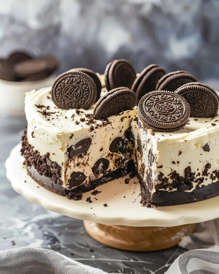 A reinvented classic. Vanilla sponge cake baked with Oreo cookie pieces, filled with a creamy buttercream and decorated with more Oreo pieces on the sides for an extra touch of flavor and texture.