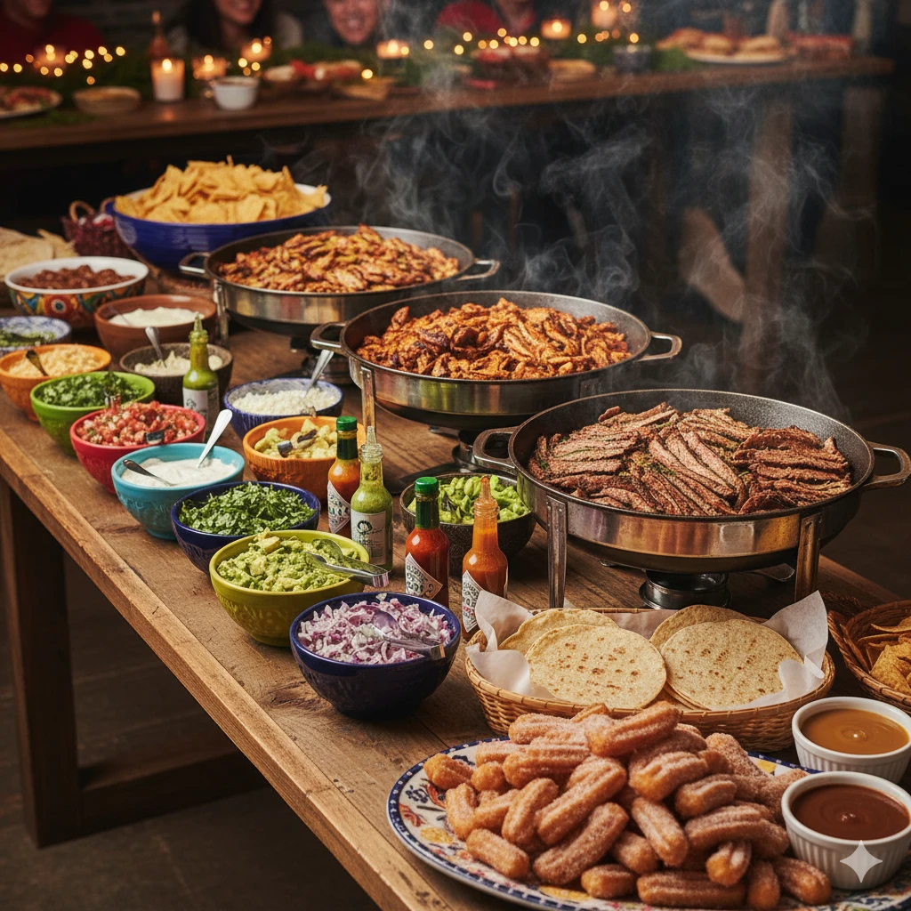 Also includes all toppings, rice, beans, churro bites, and drinks.